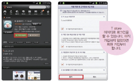 ❶ 애플리케이션 화면에서 [T cloud]를 실행한다. [T store]의 T cloud 화면이 나타나면 ‘무료 재설치’를 눌러 설치한 후 다시 실행한다.