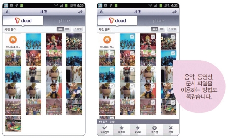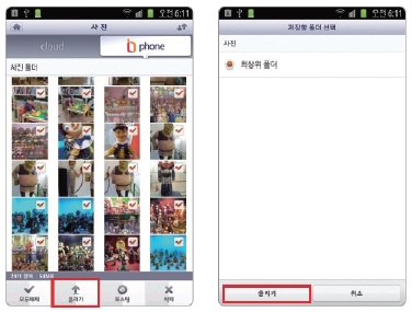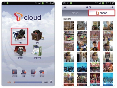 ❷ [T cloud] 화면이 나타난다. ‘사진’을 누른 후 ‘phone’을 누르면 갤 럭시 노트에 저장되어 있는 사진들이 나타난다.