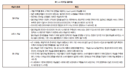 e-리테일 플랫폼에는 멀티채널, 크로스 채널과 최근에 급부상하고 있는 옴니채널 등이 있는데 각각의 특징들을 표 1과 같이 정리해보았다.
