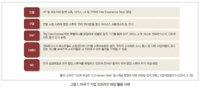 오프라인 매장 운영 경험이 없는 IT 기업들은 단기간에 저렴한 비용으로 최대 홍보 효과를 거둘 수 있는 팝업 스토어(Pop-up Store; 짧게는 하루, 길게는 두 달 정도 한정된 기간만 운영하는 임시 매장으로, Pop-up window 용어에서 유래)를 적극 활용하고 있다. 이러한 팝업 스토어 구성을 통해 브랜드를 알리고 이미지 구축 효과도 거둘 수 있다.