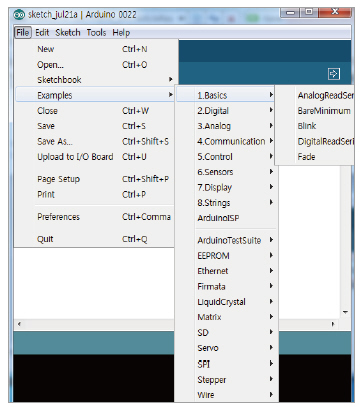 그림 2. Arduino 프로그램 예제 선택 화면