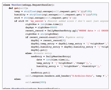 스마트폰 연결 서버는 웹 서버, 데이터베이스 등을 구현한 독자적인 서버를 구현할 수도 있지만 매우 간단하게 구현할 수 있는 방법도 있다. 그 방법은 구글의 앱 엔진을 사용하는 방법이다. 구글 앱 엔진을 사용하면 간단한 서버의 경우에는 파이선과 같은 언어로 쉽게 구현할 수 있기 때문에 개발 초기에는 좋은 접근 방법이다. 그림 6은 파이선 언어를 사용해 서버를 구현한 소스의 일부분이다.