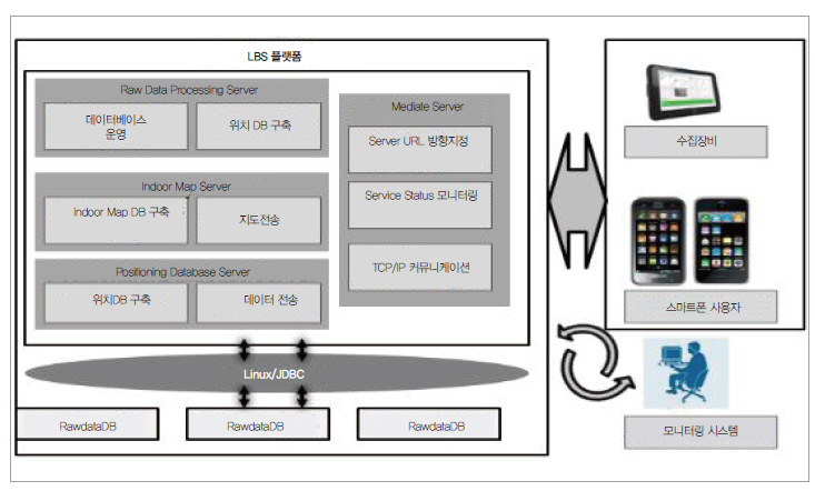 LBS 플랫폼은 건물 내에 설치된 무선 인프라의 위치 정보와 실내지도를 데이터베이스로 구축 및 관리하고, 스마트폰 사용자의 요청에 따라 사용자가 위치한 특정 건물의 실내 지도 데이터와 Wi-Fi 위치 정보를 제공한다. 그림 1은 플랫폼의 구성과 외부 디바이스 사이의 연동을 위한 관계를 나타낸 것이다.