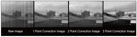 NUC(Non Uniformity Correc-tion)는 감도에 대한 선형 보정을 의미하며, 영상 품질에 영향을 주는 요소다. NUC는 세 단계로 나뉜다. 1 Point Correction은 지정 수치만큼의 Dark Noise를 제거하는 최소 보정이다. 다음으로 2 Point Cor-rection은 특정 광학 조건에서 Dark noise와 Shot Noise를 제거하는 일반 보정을 말한다. 마지막으로 3 Point Correction은 다양한 노출 시간에 대한 Dark Noise와 Shot Noise를 제거하는 고급 보정이다.