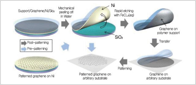 그래핀의 대면적 성장에 대한 연구 개발은 소재뿐 아니라 소자로서의 응용까지 염두에 두고 진행됐다. CVD 성장 방식은 원하는 기판 위에서 이루어지는 것이 아니기 때문에, 성장시킨 후 다른 기판으로의 전사 과정이 반드시 필요하다.