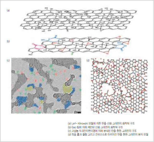 ▲ 그림 2. 산화 그래핀과 환원 그래핀의 화학적 구조와 원자 구조
