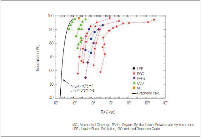 ▲ 그림 3. 다양한 방법으로 제작된 그래핀 투명전극의 전기저항과 투명도의 상관관계 그래프