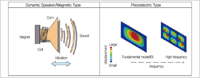 그림 3은 기존 스피커와 압전 스피커의 차이점을 나타낸다. 기존 스피커가 피스톤 운동을 응용한 것이라면 압전 스피커는 완전히 다른 개념을 사용한다. 피스톤 운동이 공명현상을 회피하는 개념이라면 압전 스피커는 공명현상을 적극적으로 이용하는 데서 출발한다.