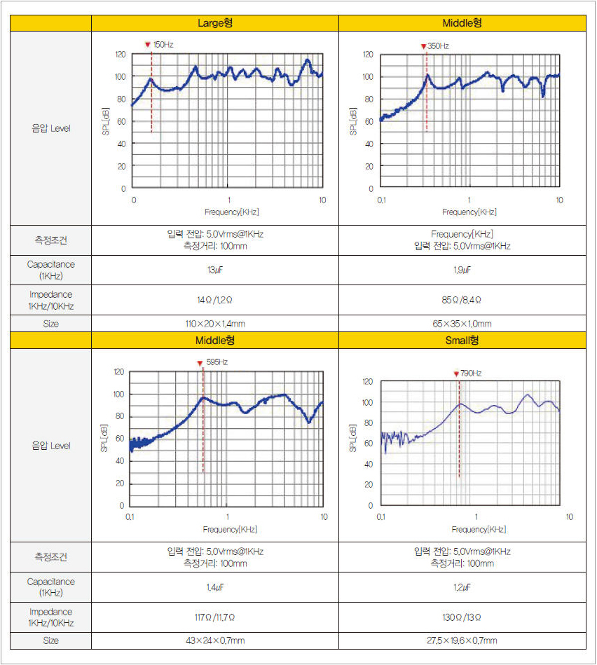 압전 스피커의 출력 음압 특성은 인가된 전기 신호를 소리로 바꾸는 스피커의 능률을 의미한다. 즉, 공기 중 소밀파의 음압 레벨(음의 크기)을 말하는 것이다. 출력 음압의 정도는 SPL(Sound Pressure Level)이라 하고 dB로 표시한다. 그림 4는 교세라에서 출시한 압전 필름 스피커의 음압 레벨 특성을 나타낸 것이다.