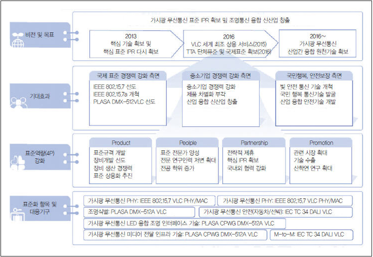 가시광 무선 통신의 국제 표준 활동은 아직까지 미미하다. 따라서 한국정보통신기술협회(TTA) 중심의 표준 활동을 적극적으로 수행해 국내 고유 표준 제정을 우선적으로 수행하고, 이에 대한 IPR을 확보해야 한다. 이후 국제 표준 제정의 선도적 활동을 통해 국제 표준 규격이 되도록 하는 것을 최종 목표로 해야 한다.