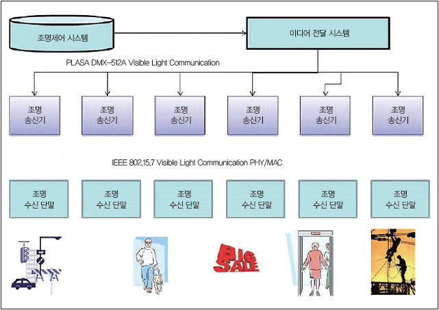 가시광통신(Vigible Light Communication, VLC)이란 LED 조명을 광원으로 이용한 통신기술을 말하며, 현재 LED는 그 사용 범위와 사용률이 급속하게 증가하는 추세다. 이러한 인프라의 배경에 맞춰 조명과 통신을 함께 할 수 있는 서비스를 표준으로 제정할 필요성이 대두되기 시작했다(그림 1).
