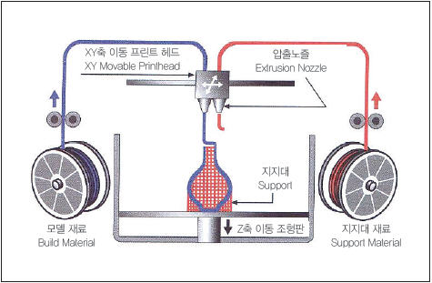 FDM은 고체 필라멘트 형태의 플라스틱 재료를 고온의 헤드에서 가열하여 노즐을 통해 압출시킨 후, 한 층씩 쌓아 올리는 방식이다(그림 2). 현재 세계 시장 점유율 1위의 방식이며, 높은 정밀도와 반복성을 지니는 것이 특징이다. 고강도 재료를 사용해 후변형이 없으며, 그림 3과 같이 자동차, 기계산업, 로봇 등에 적용된다.