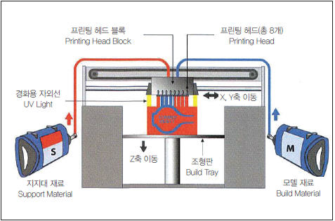 잉크젯 기술과 광경화성 수지 기술이 결합된 고해상도의 3차원 플랫폼으로, 800개의 노즐을 통해 분사되는 액상의 광경화성 수지를 자외선으로 동시 경화시켜 모델을 제작하는 방식이다(그림 4).