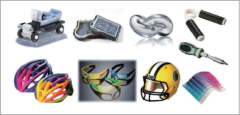 비교적 미세한 형상을 구현할 수 있으며, 다양한 재료를 사용할 수 있다는 장점이 있다. 고무 및 투명 재질을 사용하며, 소비재, 의료, 전자제품 등에 적용된다(그림 5).