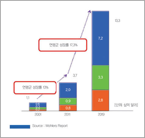 전 세계 3D 프린팅 및 관련 서비스 시장 규모는 계속해서 증가할 것으로 보인다(그림 6). 2001년 11억 달러였던 시장은 2011년 37억 달러 규모로 성장해 연평균 13%의 성장률을 보였다. 2019년 예상 시장 규모는 133억 달러로 연평균 17.3%의 성장률을 보일 것으로 전망된다.