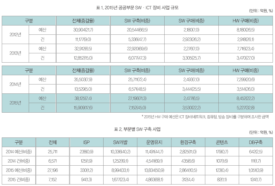 미래창조과학부와 행정자치부에서는 2015년 공공부문 SW·ICT 장비 사업 규모가 3조 8,125억원이며 이는 전년 대비 2,622억원(7.4%) 증가한 금액이라고 발표했다(표 1).