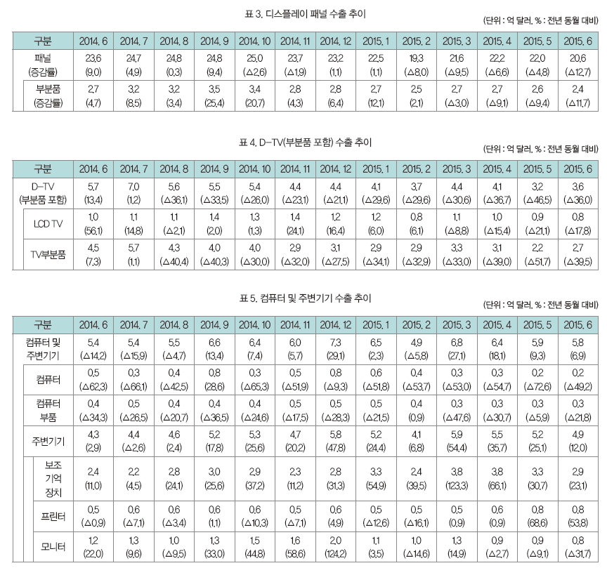 시장 조사 기관인 가트너에 따르면, 2015년 전 세계 ICT 시장은 1.3% 정도 하락할 것이라고 한다. 이와 같이 ICT 시장이 축소되고, 교역 여건이 악화됨에 따라 올해 상반기 ICT 시장은 반도체, 휴대전화를 제외하고 대부분 수출 하락세를 나타냈다. 그러나 5월 들어 2.0%, 6월 0.2% 수출이 증가하면서 2개월 연속 무역 수지 흑자 달성에 기여했다.