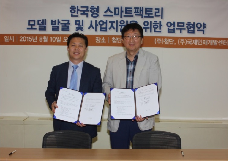 지식과 기업의 가치를 키워가는 (주)첨단이 지난 8월 11일, (주)국재인재개발센터(이하 IMD)와 한국형 스마트공장 모델 발굴 위한 업무협약(MOU)을 체결했다. 양사는 업무협약으로 한국형 스마트공장 모델 발굴을 비롯해 세미나, 컨퍼런스, 컨설팅, 인증, 홈페이지 운영, 전시, 홍보, 연수 지원 등의 사업을 공동으로 추진한다.