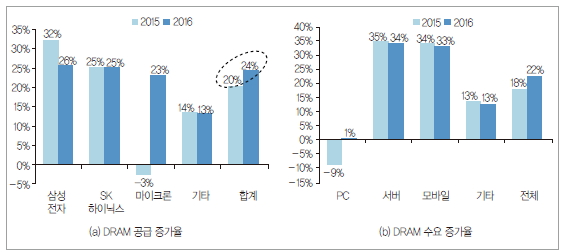 2016년 DRAM 시장을 살펴보면, 공급 증가율이 수요 증가율을 웃돌 것으로 전망된다. 올해 DRAM 수급의 경우, PC DRAM 수요가 급감함에 따라 마이크론의 비트 그로스(Bit Growth : 메모리 반도체의 전체 성장률)가 마이너스를 나타냈다.
