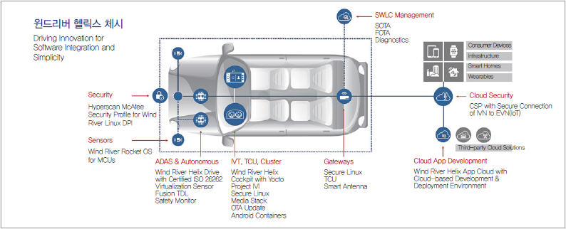 윈드리버의 오토모티브 부문 포트폴리오 ‘헬릭스 체시’는 인포테인먼트, 텔레매틱스, 디지털 클러스터 시스템 등 소비자 중심의 임베디드 디바이스 관련 기술과 더불어, ADAS(지능형운전자보조시스템) 및 자율 주행 시스템 등의 안전성 관련 기술, 그리고 클라우드 기반 개발 툴 및 애플리케이션을 위한 최신 기능 등으로 구성되어 있다.