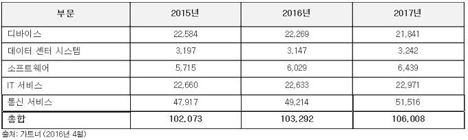 <표2> 2015~2017년 한국 부문별 IT 지출 전망 (단위: 십억 원)