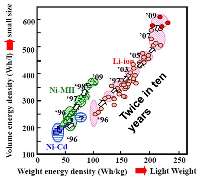 대표적인 배터리 강국인 일본은 그동안 니켈-카드뮴전지, 니켈수소전지, 리튬이온전지를 상용화에 성공하였으며, 이러한 기술상용화 경험을 통해 배터리는 10년에 두배 정도의 에너지밀도와 출력밀도의 향상이 가능하다고 보고 있다. 결국 배터리 기술의 기술개발 속도는 타분야에 비해 더디게 진행 된다고 할 수 있다.