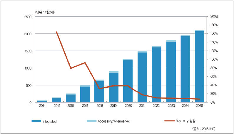 글로벌 시장분석기관인 IHS는 무선충전 리시버 연간 출하량은 2020년에 10억 대, 2025년에 20억 대를 넘어설 것으로 전망했다(그림 1).