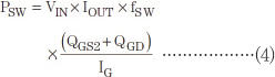 여기서 VIN=VDS(드레인 투 소스 전압), IOUT=ID(드레인 전류), fSW는 스위칭 주파수, IG는 게이트 전류이며 QGS2와 QGD는 드라이버가 FET를 충전하는 데 걸리는 시간에 좌우된다.