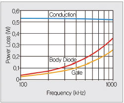R은 선택한 MOSFET의 RDS(on)이고, I는 그 MOSFET을 거치는 실효(Root-Mean-Square ; RMS) 전류이며, 또한 둘 중 어느 쪽도 스위칭 주파수와 함수 관계에 있지 않다는 점에 유의해야 한다.