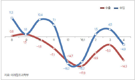 ▲ 그림 1. ICT 전년 동월대비 수출입 증감률(%)