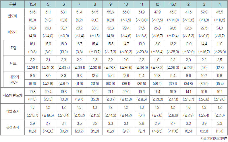 반도체와 디스플레이의 올 4월 수출액은 각각 45.5억 달러와 21.3억 달러로 작년 같은 달보다 각각 11.8%, 27.6% 하락했다(표 1). 이에 대해 미래부는 “반도체는 수요 청제가 지속되는 가운데, 공급 과잉에 따른 단가 하락으로 수출 하락폭이 확대됐다. 디스플레이의 경우, 중국 기업의 물량 공세와 글로벌 수요 부진으로 감소세가 지속되고 있다”고 설명했다. 다만, OLED는 시장 규모 확대로 수출 증가세가 지속되고 있다는 점은 위안거리다.