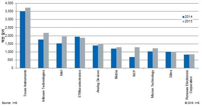 산업용 반도체 기업 중에서 텍사스 인스트루먼트(Texas Instruments)는 2015년에도 매출 기준 전 세계 1위를 차지했으며, 인피니언 테크놀로지(Infineon Technologies)와 인텔(Intel)이 각각 뒤를 이었다. ST마이크로일렉트로닉스(STMicroelectronics)는 4위로 하락한 반면, 아날로그 디바이스(Analog Devices)는 5위를 유지했다.