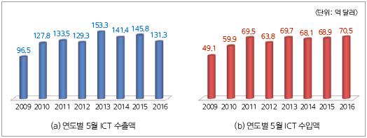 올해 5월 ICT(정보통신기술) 수출은 131억 3천만 달러, 수입은 70억 5천만 달러로, 그리고 무역수지는 60억 8천만 달러 흑자로 잠정 집계됐다. 산업통상자원부의 자료에 따르면, 수출의 경우 휴대폰, 반도체, 디스플레이 등 주력 품목 중심으로 전년 동월대비 9.9% 감소했으나, 유기발광다이오드(OLED)는 지속적으로 증가하고 있다. 수입은 시스템 반도체와 컴퓨터 및 주변기기 중심으로 증가했다.