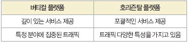 즉, 버티컬 플랫폼이란 특정한 분야에 관심을 가지고 있는 이용자들을 대상으로 전문 장르인 음악, 동영상, 게임, 쇼핑, 뉴스, 교육 등 세부 분야로 나누어 한 분야에 대해 서비스를 제공하거나 검색, 커머스, 커뮤니티 등 기능 중 하나를 선택하여 집중적으로 서비스하는 방식이다. 이에 비해, 호리즌탈 플랫폼은 네이버나 카카오처럼 다양한 서비스를 제공하는 사업자를 말한다. 버티컬 플랫폼은 호리즌탈 플랫폼보다 더 깊이 있는 정보 및 서비스를 제공한다고 말할 수 있겠다.