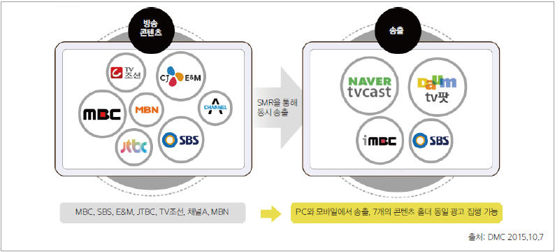 한편, 한국의 대표적 호리즌탈 플랫폼은 네이버TV캐스트와 다음TV팟이다. <그림 4>에서 보듯이, 지상파 방송연합 제공의 OTT 동영상인 푹(Pooq)이 버티컬 플랫폼으로 존재하는 가운데, 네이버TV캐스트와 다음TV팟을 통해서도 송출되는 방송 PP들이 등장하게 된 것이다. 이는 SMR(Smart media Rep.)이 2014년 5월 푹 광고 판매와 함께 출범하면서부터이다.