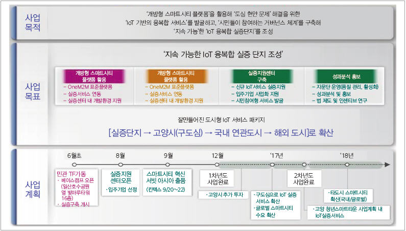 ‘IoT 융복합 시범단지 조성’ 사업은 지자체와 민간 기업이 협력해 IoT로 교통, 치안 등 고질적인 도시 문제를 해결하는 사업으로, 앞으로 2년 동안 개방형 스마트시티 플랫폼을 활용해 도시 현안 해결을 위해 IoT 기반의 융·복합 서비스를 발굴하고, 시민 및 공공기관 대상의 실증을 거쳐 사업화 및 확산할 수 있는 IoT 융복합 시범단지를 조성한다(그림 1).