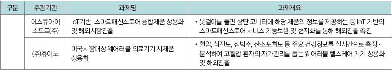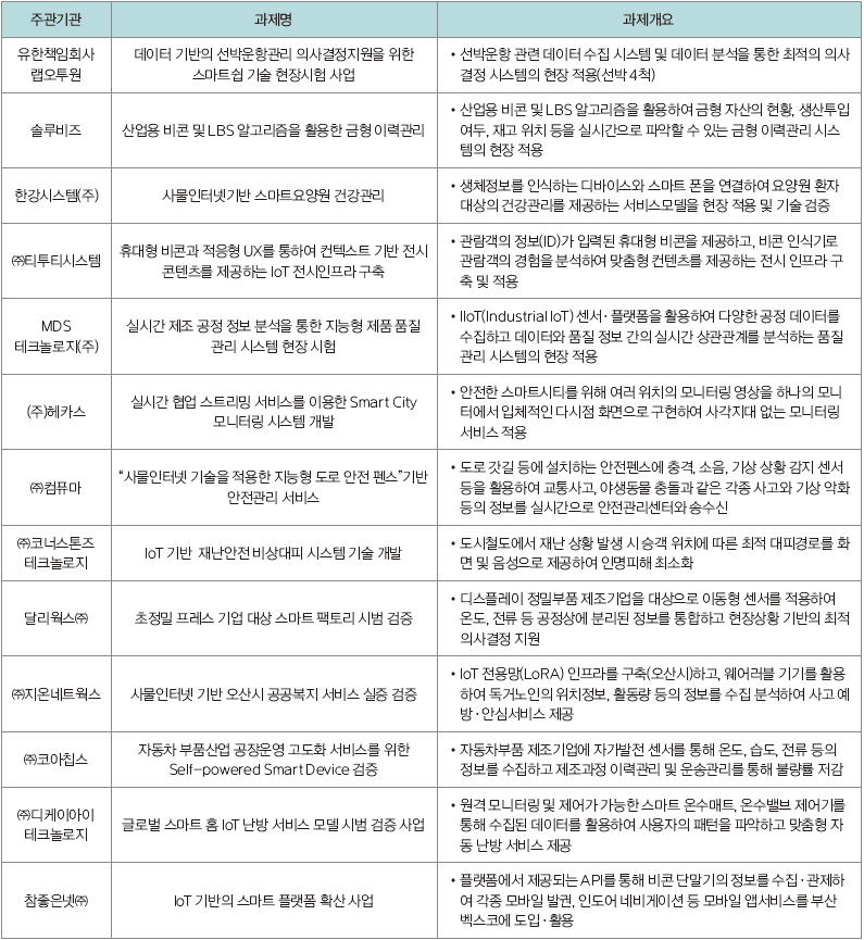 IoT 중소기업 지원 사업은 IoT 분야의 역량 있는 중소 벤처기업의 창의적인 아이디어를 발굴하고 제품 서비스로 사업화될 수 있도록 지원한다. 민간의 창의적인 아이디어가 자유롭게 발전할 수 있도록 특정한 영역을 정하지 않은 자유 공모로 진행됐으며 ‘서비스 검증 확산(표 1)’ 및 ‘융합 제품 상용화(표 2)’ 부문에서 총 28개 과제가 선정됐다.