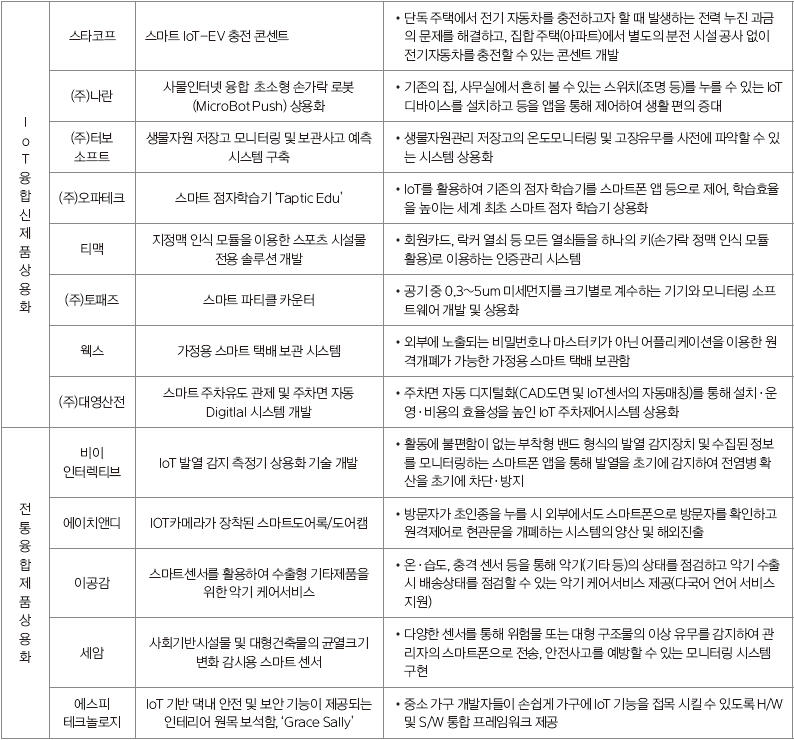 2016년에는 IoT 분야 전문 중소 벤처기업을 육성하는 중소기업 지원 사업과 지자체 및 민간 기업과 협력해 IoT로 교통 체증 등 도시 현안을 해결하는 IoT 융복합 시범단지 조성 사업을 추진한다.