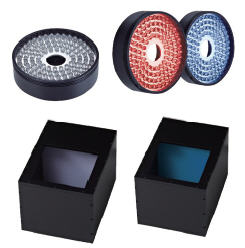그리고 사각 동축 조명(COX 시리즈)은 빔 스플리터(Beam Splitter)를 이용해 렌즈의 시야각(이미지 축)과 조명의 입사각(광축)이 일치하는 조명으로, 반사가 심한 대상에 사용된다. 금속면 등 경면 조사에 적합하며 반사도의 차이를 식별하고 이미지화하는 데 적용 가능할 뿐 아니라 하프 미러(Half Mirror)가 채용되어 있다. 유리 금속 표면, 필름 등 경면 반사 물체의 스크래치나 문자를 인식하는 데 적합하다.