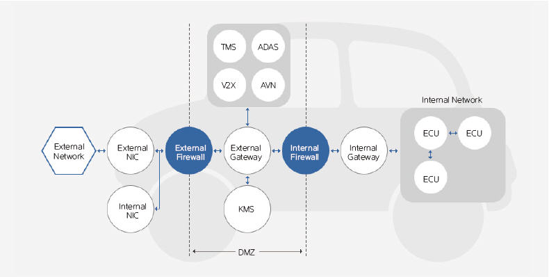 외부와 통신이 가능해야 하는 서버의 경우에는 외부 방화벽과 내부 방화벽 사이에 DMZ를 설정하여 보호하는 방법을 적용하고 있다. 차량의 경우에도 이와 같은 접근법이 필요하다. 외부와 통신이 가능하면서도 내부 네트워크의 ECU와도 통신이 가능해야 하는 헤드 유니(head unit)들은 외부 방화벽과 내부 방화벽으로 차폐되는 DMZ 영역에 두어야 한다.