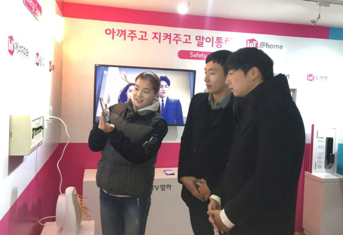 체험 부스에서는 'IoT@Home'의 에너지미터, 온도조절기, 스위치, 플러그, 맘카, 열림감지센서, 가스락 등 LG유플러스의 IoT 제품을 직접 체험할 수 있다.
