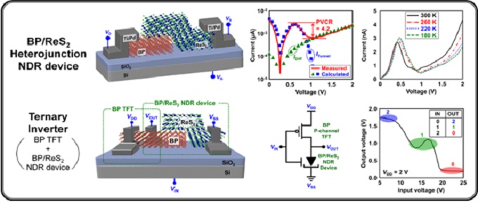 성균관대 박진홍 교수 연구팀은 2차원 물질 기반 부성미분저항 특성 소자와 p형 트랜지스터 2개의 소자로 3개의 논리상태를 갖는 3진 인버터 회로를 구현하는 데 성공했다.