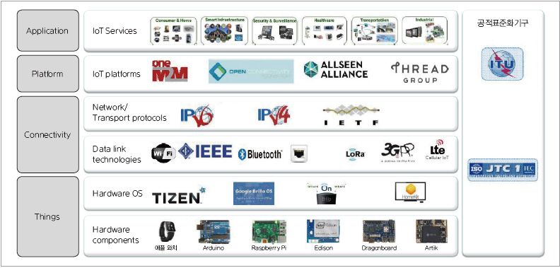 IoT 플랫폼/응용서비스 분야의 경우는 글로벌 IoT 선도기업들은 독자적으로 △ 하드웨어 개발 모듈(인텔 IoT 플랫폼, 삼성의 아틱 등) △ 경량 OS(구글의 브릴로, 삼성의 타이젠 등) △ 다양한 IoT 개발 도구(애플의 홈킷, 삼성의 스마트싱스 등) 등을 제공하고 있다. 반면, 다른 기업과의 표준화 컨소시움 구성을 통해 시장주도권 확보에 열을 올리고 있다. 기존 표준화 단체와는 달리, 이들 IoT 컨소시움은 표준 규격과 오픈 소스 개발을 동시에 진행한다는 점이 큰 특징이다. 우리나라는 미국, 유럽, 중국, 일본, 인도 등의 대표 민간 표준화단체가 2012년 7월 결성한 글로벌 IoT 표준화 기구인 oneM2M의 핵심 멤버로서 IoT 플랫폼 응용 서비스 분야 국제표준 형성에 주도적 역할을 수행하고 있다. 그리고, IoT 표준 역량 강화를 위한 사물인터넷포럼과 oneM2M 기반의 오픈소스 프로젝트를 운영 중이다.