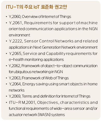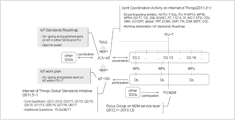 ITU-T는 사물인터넷(IoT) 관련 기술의 국제표준화에 있어 가장 앞서 나가고 있다고 볼 수 있다. 이미 2005년도 ITU Internet Report 2005 –The Internet of Things를 통해 사물인터넷의 중요성을 강조했으며, 2011년부터 JCA-IoT 및 IoT-GSI를 구성해 사물인터넷 관련 표준화 활동의 조율 및 표준화를 추진해 오고 있다. 이를 통해 ITU-T는 2012년 국제표준화 기구 최초의 사물인터넷 관련 국제표준인 Y.2060을 제정한 바 있다.