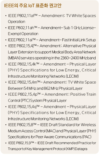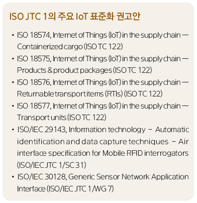 특히, 작년 6월 한국 주도로 사물인터넷 연구반(SG 20)이 설립됐으며, ETRI 표준연구센터장인 김형준 박사가 ‘사물인터넷 및 스마트 시티’연구반의 전체 부의장과 사물인터넷 총괄작업반 의장에 선임된 바 있다. 한국이 명실상부 ITU의 사물인터넷 기술 표준화 전체를 총괄하는 책임자의 역할을 맡게 된 것이다.