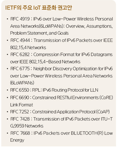 최근 IETF에서는 전통적인 TCP/IP 프로토콜 스택에서 벗어나 다양한 물리적인 제약 조건을 가진 디바이스들도 인터넷에 연결할 수 있는 기술 개발을 통해 사물인터넷을 구축하려는 시도를 하고 있다. 이를 위해 IETF에서는 6LoWPAN, 6lo, 6tisch, core, roll, lwig, dice, ace 등 여러 워킹그룹을 통해 관련 표준 기술을 개발 중에 있다. 지금도 IETF에서 IoT 관련 워킹그룹의 수는 많지만, 앞으로 그 수는 더 늘어날 것으로 전망되며 관련 표준기술 개발도 더 활발해질 것으로 예상되고 있다.