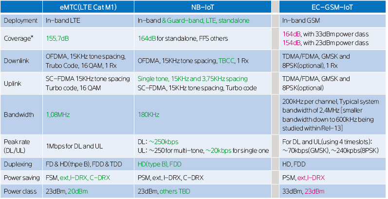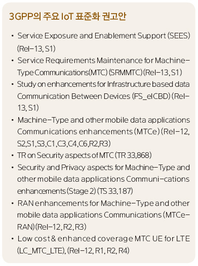 세계 이동통신 표준화 기술협력기구인 3GPP(3rd Generation Partnership Project)는 GSM, WCDMA, GPRS, LTE등의 무선 통신 관련 국제 표준을 제정하기 위해 1998년 12월 창설된 이동통신 표준화 기술협력 기구다. 3세대 이동통신규격인 WCDMA, HSDPA 등의 규격을 제정한 바 있고, 현재 LTE-Advanced 표준을 개발 중이다. 최근 3개 저전력 장거리 통신 기술(LPWA, Low Power, Wide Area)을 릴리즈13(Release 13)의 허가 주파수에 표준화하기로 결정했다. 합의된 이 규격은 급성장하는 IoT 시장에 대응하는 것으로 일명 협대역 IoT(NB-IoT)와 기존의 진화 기술인 EC-GSM-IoT, LTE MTC Cat-M1을 포함하며 모든 LPWA 사용 사례를 포괄한다(표 2 참조).
