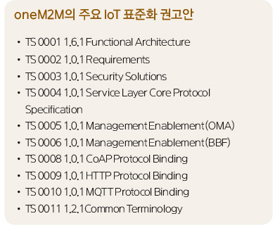 oneM2M은 2014년 8월, 전 세계 사물인터넷(IoT/M2M) 서비스 플랫폼 표준을 개발하기 위해 출범됐다. 후보 릴리즈(Candidate Release) 1 규격이 승인 및 완료됐으며, 후보 릴리즈 1은 요구사항(Requirements), 아키텍처(Archi-tecture), 프로토콜(Protocols), 보안(Security) 및 장치관리(Device Management)와 관련된 9개의 기술 규격(TS:Technical Specification)을 패키지로 제공한다.