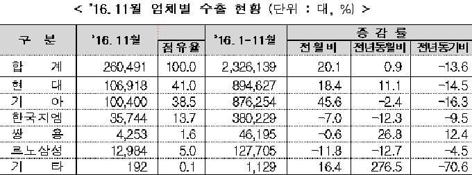 산업통상자원부는 11월 완성차 실적을 잠정 집계한 결과, 생산은 전년 동월대비 5.1% 증가, 내수는 0.2% 감소, 수출은 0.9% 증가하였으며, 수출액은 전년 동월대비 1.5% 증가한 39.8억 달러를 수출해 2015년 6월 이후 17개월 만에 증가세로 전환됐다고 밝혔다.