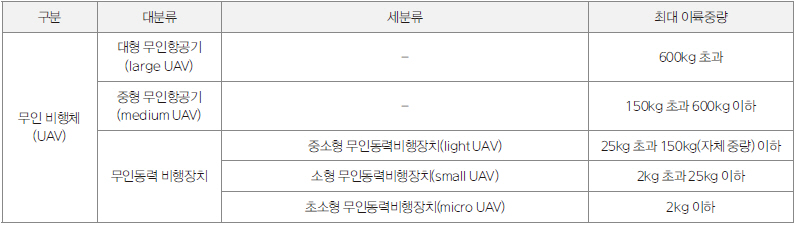최대 이륙중량에 의한 분류는 2kg 이하부터 600kg 초과까지 5단계로 구분되어 있다. 자체 중량 150kg 이하는 무인 동력비행장치로, 150kg 초과 600kg 이하는 중형 무인항공기로, 600kg 초과는 대형 무인항공기로 분류된다. 항공법에는 자체 중량 150kg까지만으로 규정되어 있다.